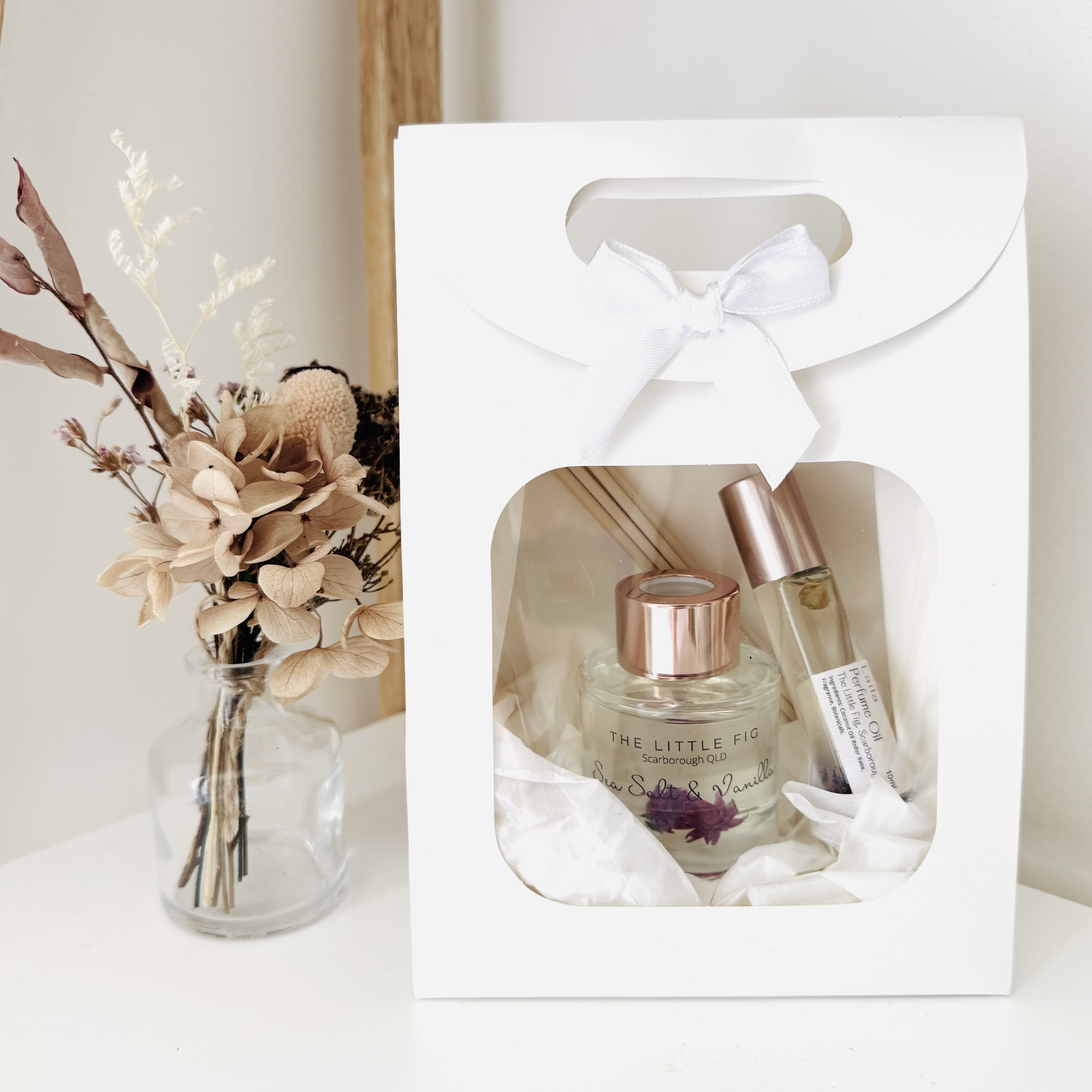 Give the gift of luxury and fragrance this Christmas with our beautifully curated gift packs. Each set includes a 50ml hand-poured reed diffuser and a 10ml roll-on perfume oil, elegantly presented in a white gift box tied with a satin bow.